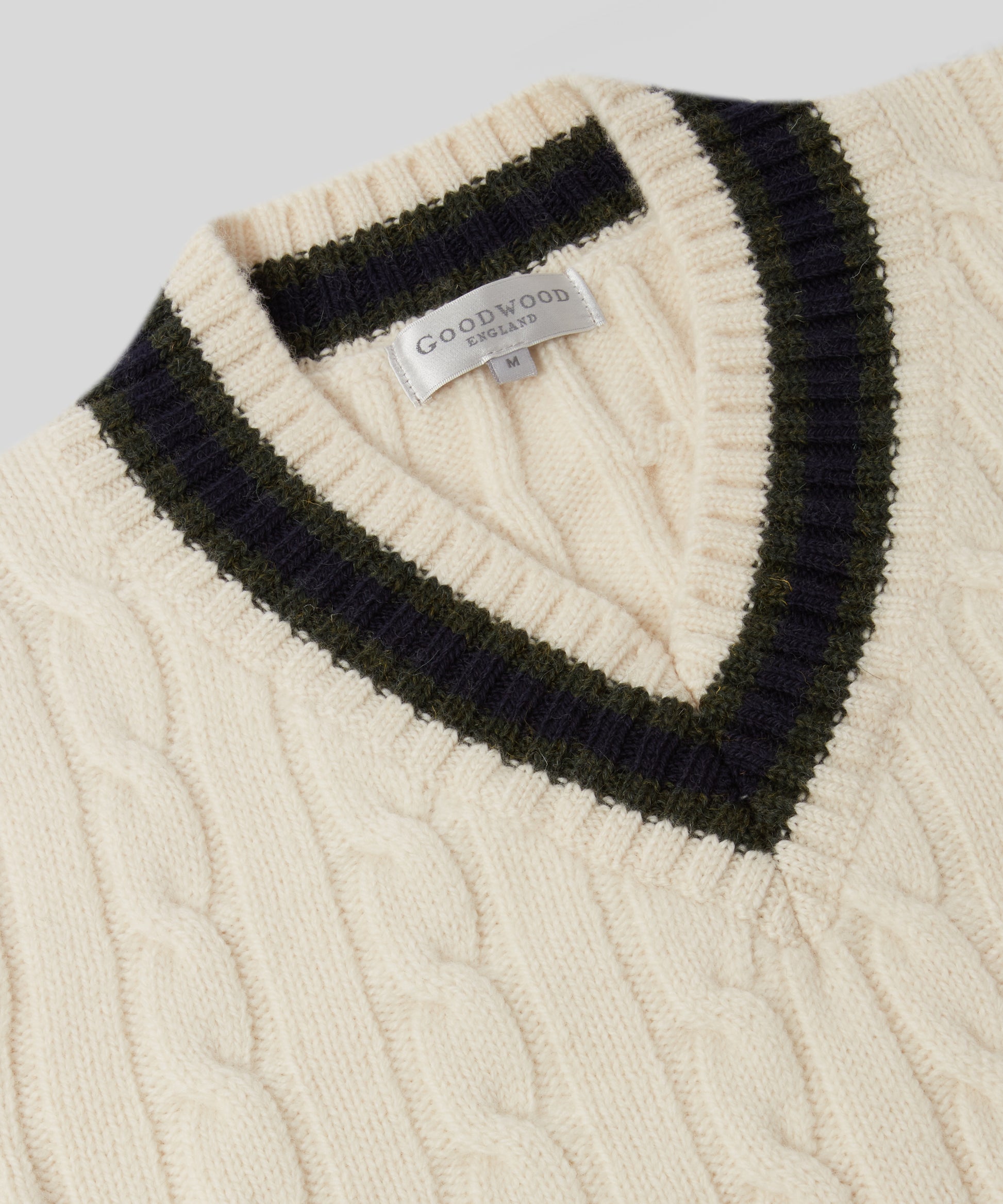 Designed with a classic silhouette and finished with Goodwood’s signature dark blue and green stripe, this knitwear embodies a spirit of sporting heritage and understated luxury. Whether layered over a collared shirt or draped effortlessly over the shoulders, it’s an icon in the making.