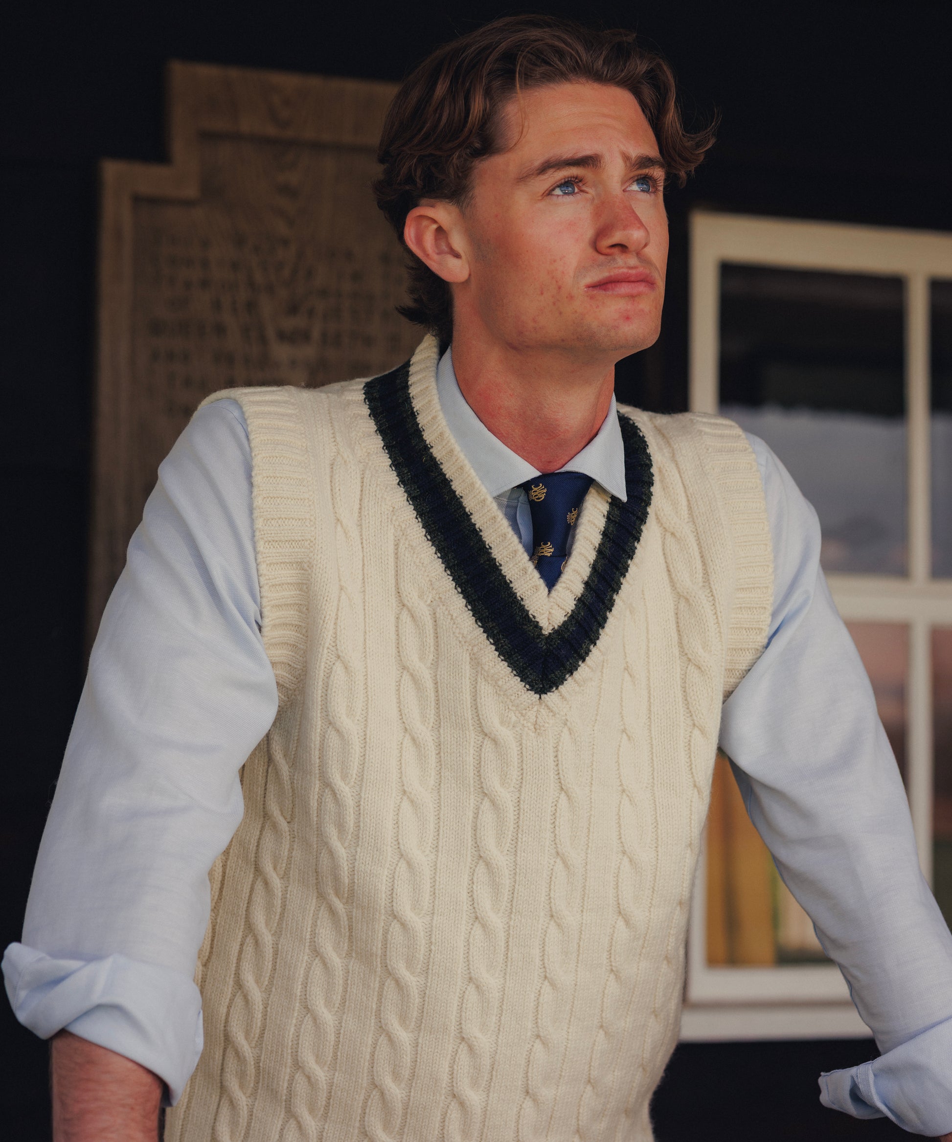 Timeless style meets impeccable craftsmanship in our new cricket tank. Inspired by Goodwood's Cricketing tradition and refined for the modern wardrobe, each piece is crafted from 100% merino wool, offering an effortlessly sophisticated blend of comfort, durability, and elegance.