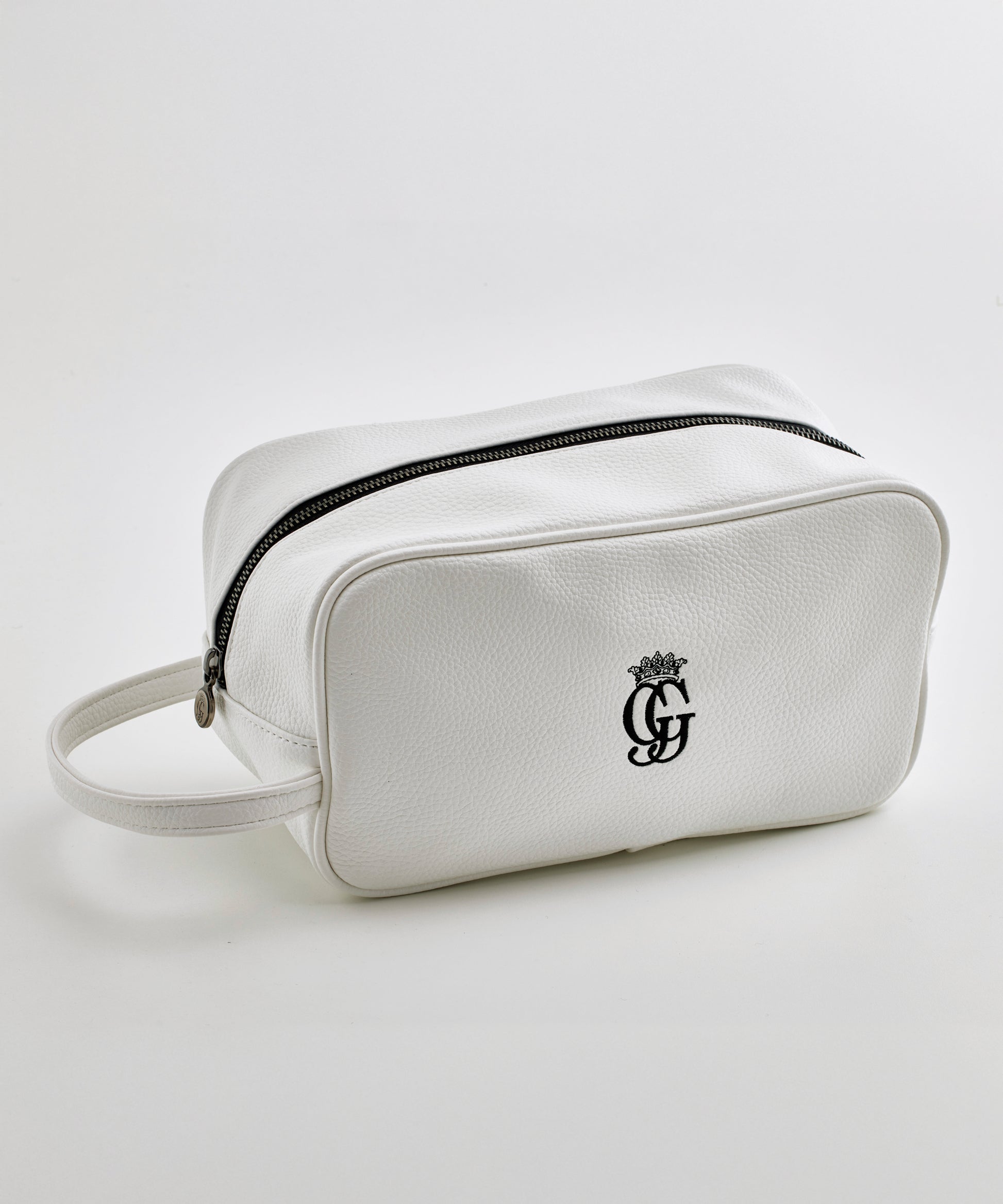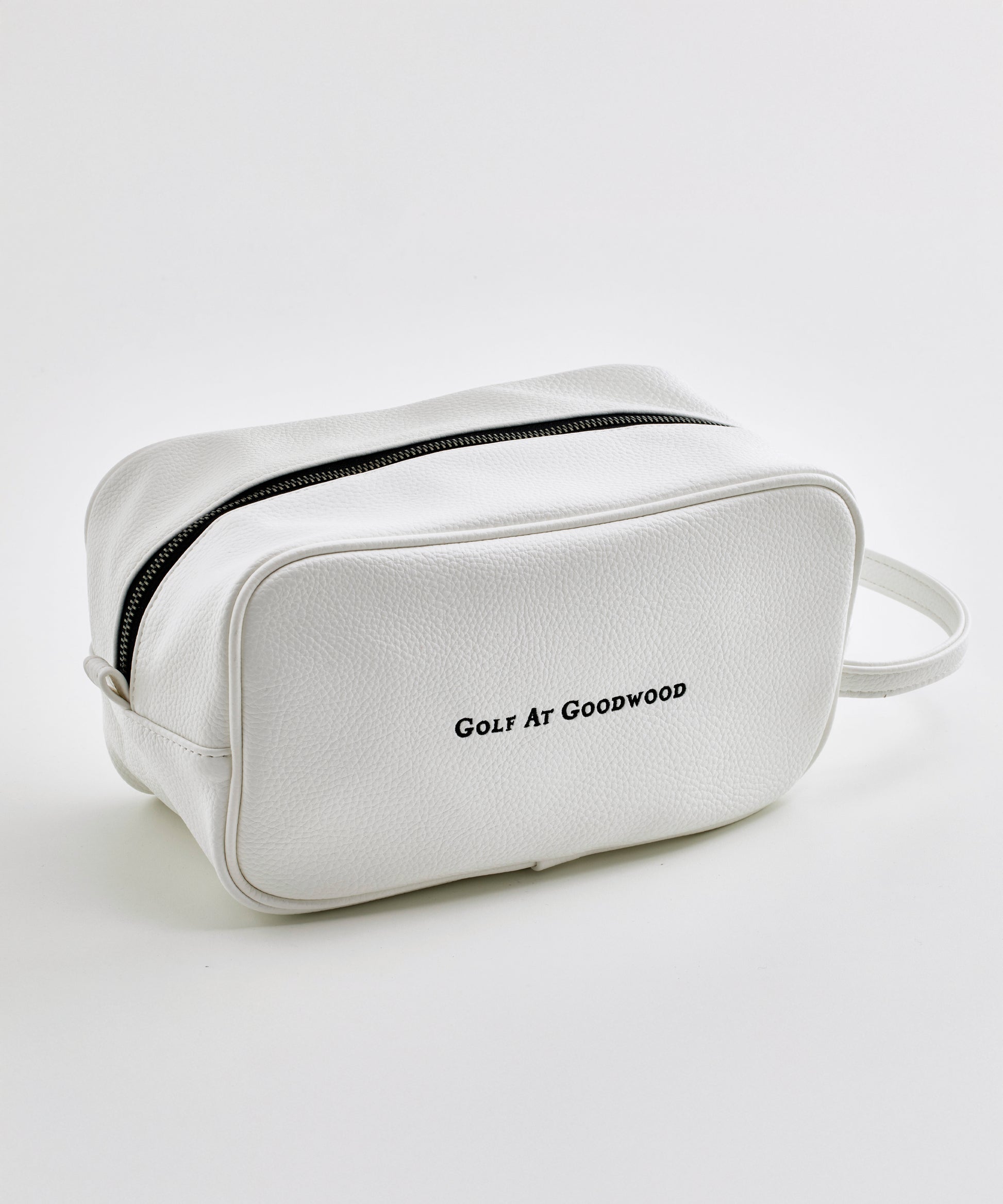 Golf At Goodwood white PU leather toiletry bag, embroidered with our Golf At Goodwood logo and GG pull tag