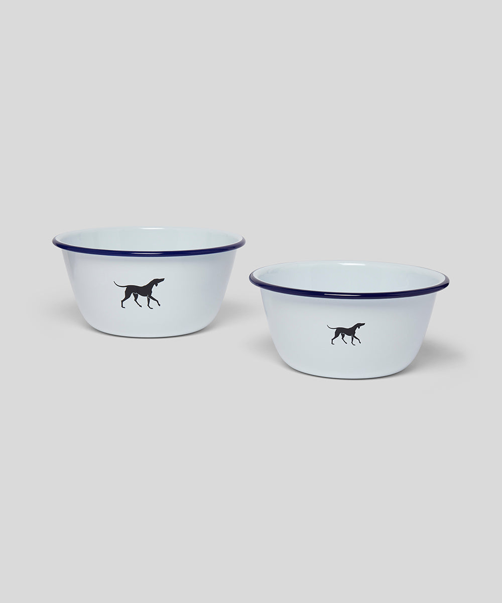 Our enamel bowls for dogs are made to the highest standard. Every piece is handmade from white enamel with navy blue rim. Complete with a painted picture of our Goodwoof hound in waling post on the outside and base shows Goodwoof. They are the perfect way to feed or water your beloved furry friend.