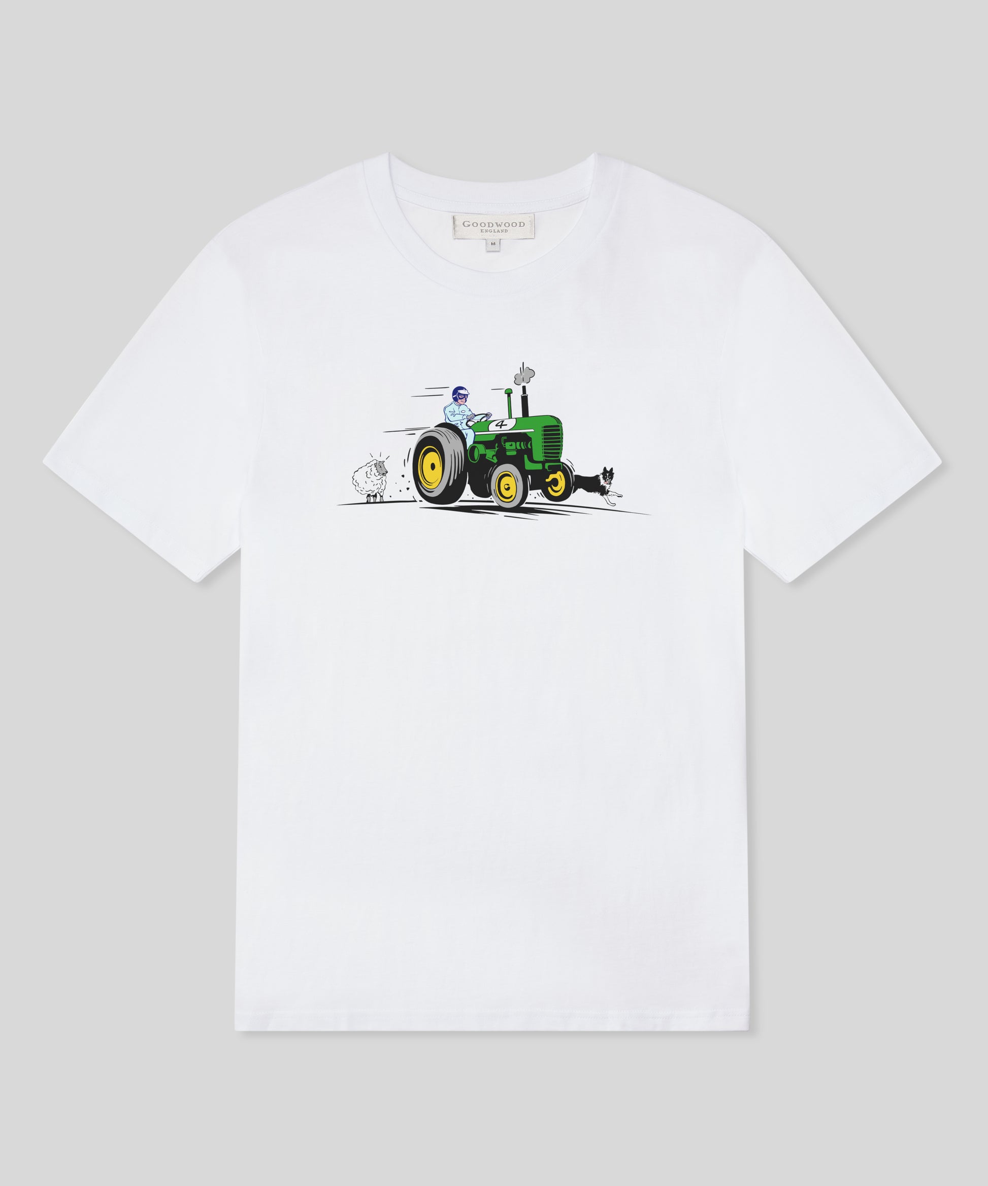 To honour this unique side of his story, our celebration t-shirt features a playful illustration of Jim Clark in his iconic blue overalls, racing a tractor painted in Lotus colours — with a sheep and sheepdog by his side.