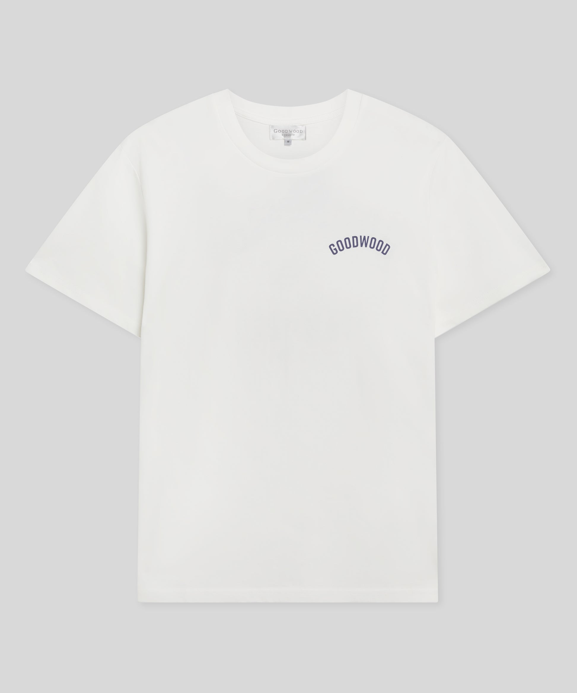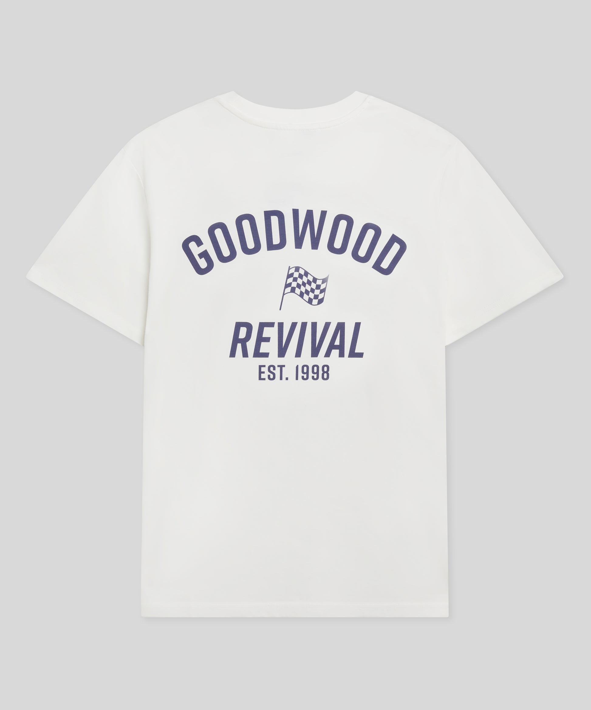 This organic cotton t-shirt features a bold Goodwood Revival est. 1998 print on the back, inspired by the nostalgic charm of old tune-up shops. On the front, a subtle Goodwood logo sits neatly on the left chest, balancing the statement style of the reverse.