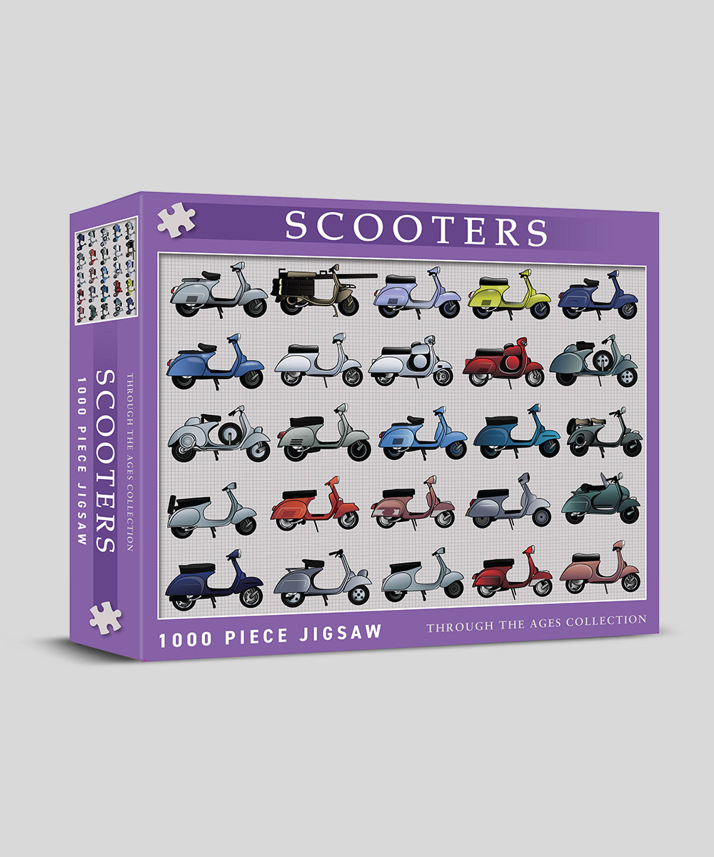This fascinating jigsaw puzzle features 25 different Scooters that have been brought to life in these beautiful illustrations.